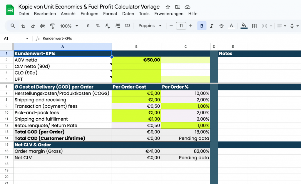 Sieh auf einen Blick, welcher ROAS deinen Gewinn maximiert – egal ob du nur den durchschnittlichen Warenkorb (AOV) betrachtest oder den CLV einfließen lässt.